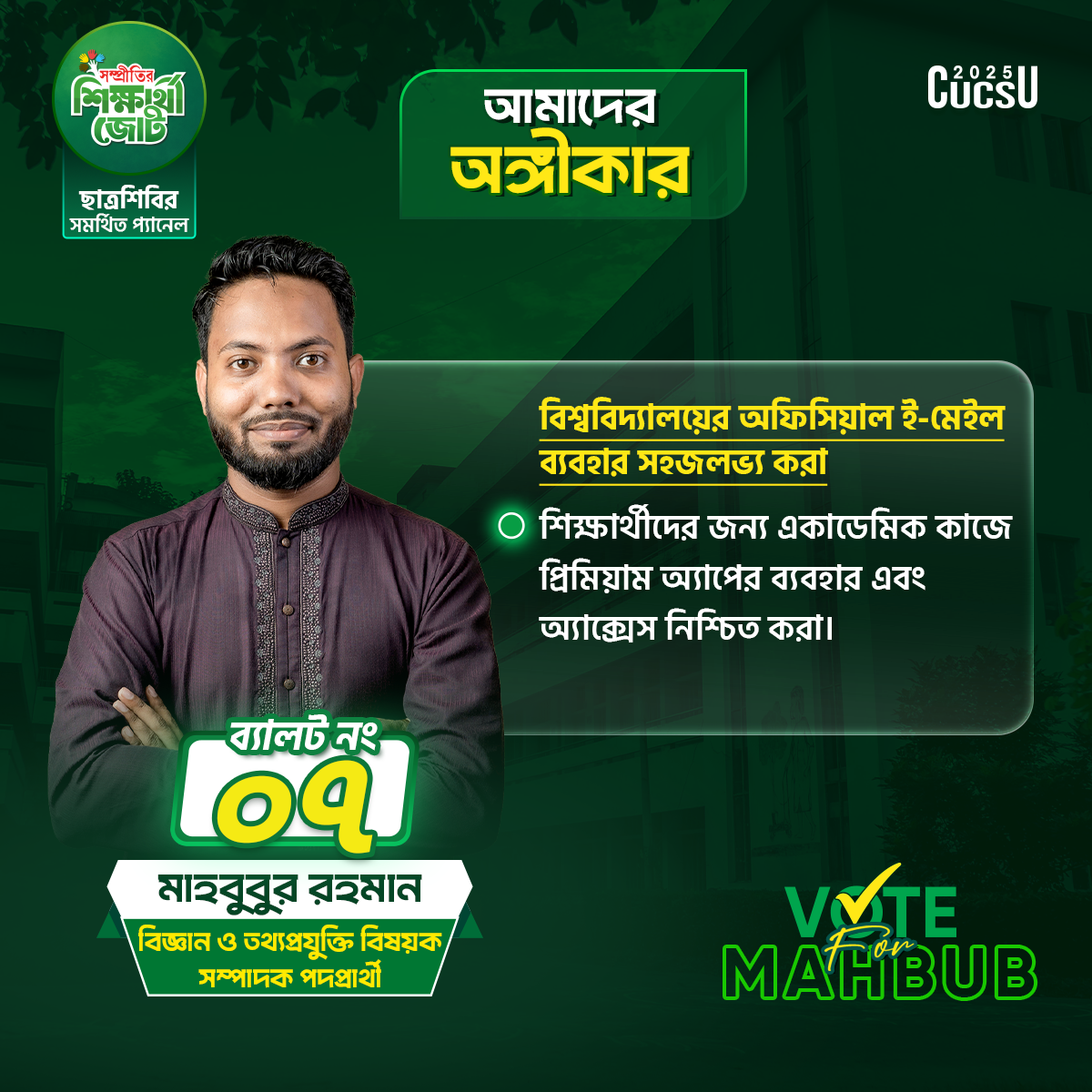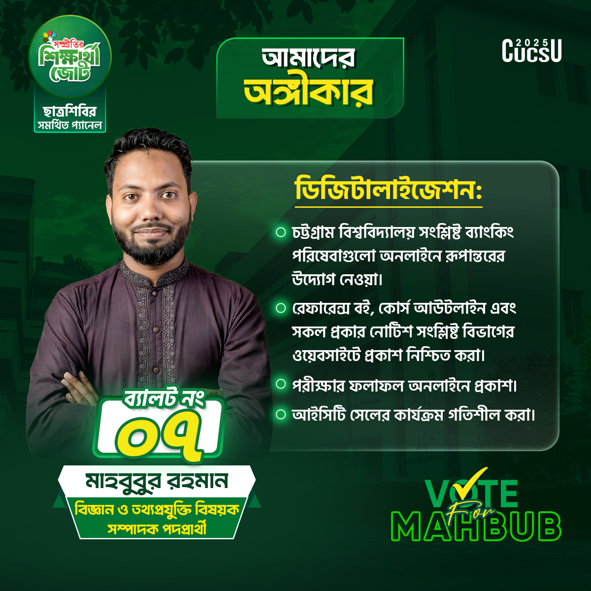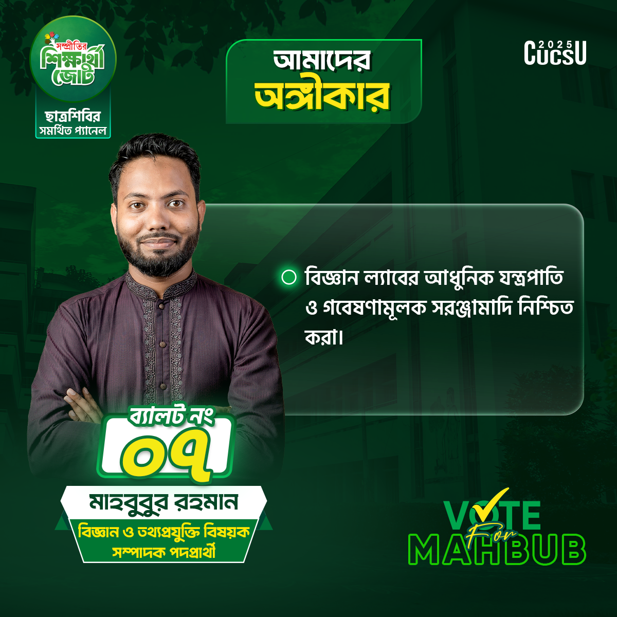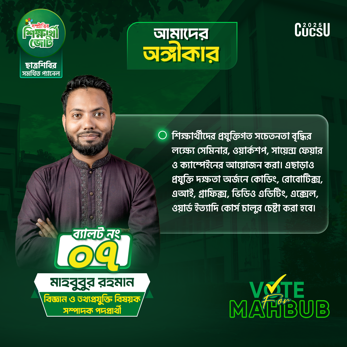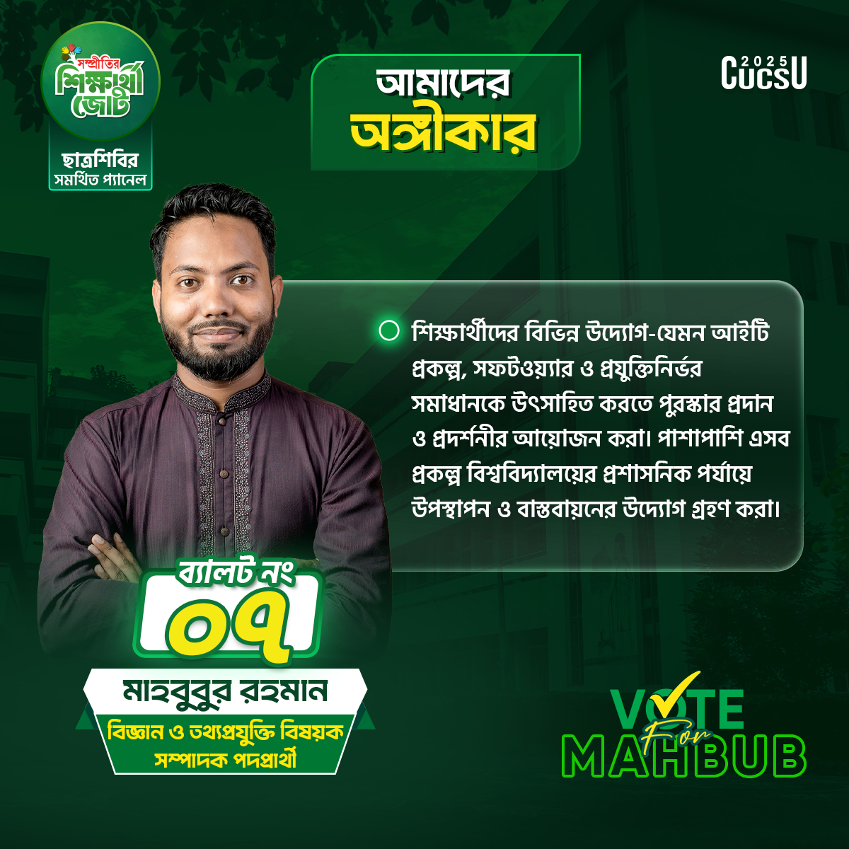 আজ সেই অভিজ্ঞতা নিয়েই মাহবুব দাঁড়িয়েছেন বিজ্ঞান ও তথ্যপ্রযুক্তি বিষয়ক সম্পাদক পদে প্রার্থী হয়ে। কারণ তিনি বিশ্বাস করেন, প্রযুক্তি ও সেবার উন্নয়নই শিক্ষার্থীদের সময়, শ্রম ও ভোগান্তি কমিয়ে এনে দেবে একটি আধুনিক, শিক্ষার্থী-বান্ধব ক্যাম্পাস।