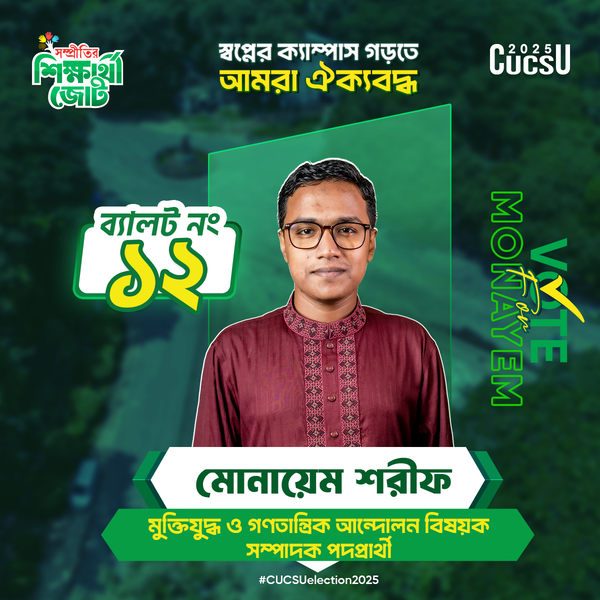স্রোতের প্রতিকুলে সত্য ও ন্যায়ের প্রাচীর মোনায়েম শরীফ তার ছাত্রজীবনে শিক্ষার্থীদের প্রতিটি দাবি আদায়ের সংগ্রামে সবসময় সম্মুখ সারিতে ছিলেন। তিনি বিশ্বাস করেন ক্যাম্পাসের আমূল পরিবর্তন আনতে এবং শিক্ষার্থীদের জন্য একটি কাঙ্ক্ষিত ক্যাম্পাস গড়ে তুলতে কার্যকর আন্দোলনের পাশাপাশি চাই সুদক্ষ ও সৎ নেতৃত্ব। বর্তমানে তিনি চট্টগ্রাম বিশ্ববিদ্যালয় ছাত্রশিবিরের শিক্ষা সম্পাদক। এর আগে তিনি এ এফ রহমান হল ছাত্রশিবিরের সভাপতি থাকাকালীন নেতৃত্বের দক্ষতা দিয়ে শিক্ষার্থীদের জন্য কল্যাণমূলক কাজ করেছেন, তাদেরকে অনুপ্রাণিত করেছেন। জুলাই গণঅভ্যুত্থানের অন্যতম সংগঠক হিসেবে তিনি দেখিয়েছেন সাহস ও ঐক্যের শক্তি দিয়ে কিভাবে অন্যায়ের বিরুদ্ধে জয়ী হওয়া যায়। তিনি চাকসু নির্বাচন-২০২৫ এ এসেছেন নতুন অঙ্গীকার নিয়ে। একটি দায়িত্বশীল এবং শিক্ষার্থীবান্ধব ক্যাম্পাস গড়ার শপথ নিয়ে। যেখানে প্রতিটি শিক্ষার্থী একটি গণতান্ত্রিক পরিবেশে সমান মর্যাদা ও নিরাপত্তা নিয়ে নিজের ভবিষ্যৎ নির্মাণ করতে পারবে।
