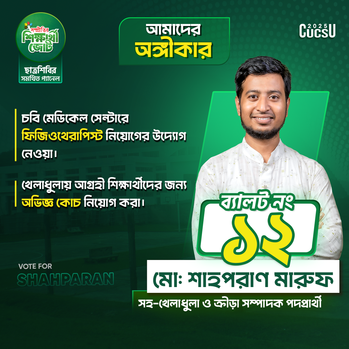 আমার অর্জিত দক্ষতার মাধ্যমে সততার সহিত বিশ্ববিদ্যালয়ের ক্রীড়াঙ্গনে ভুমিকা রাখতে আপনাদের দোয়া ও সমর্থন চাই।